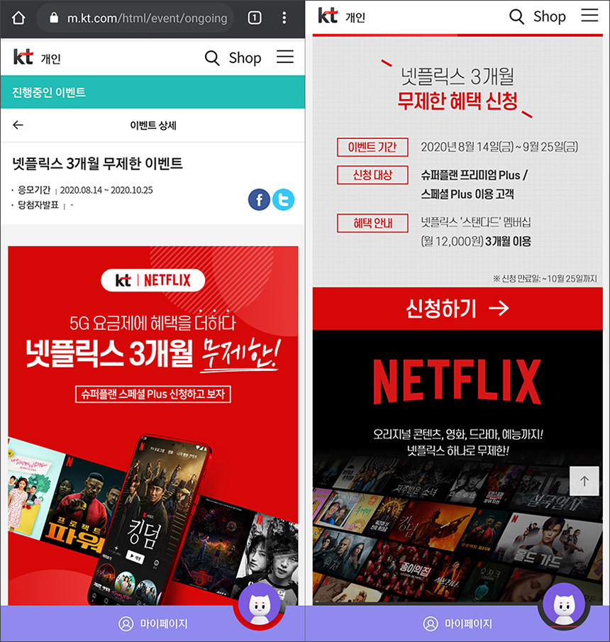 우선 KT의 이벤트 페이지를 방문하면 넷플릭스 3개월 무제한 이벤트가 진행되고 있는 것을 확인할 수 있습니다. 저는 조금 늦게 인지를 했는데 응모기간은 10월 25일까지이고 이벤트 기간은 9월 25일까지입니다. 약간 확인이 필요한 부분이라고 할 수 있습니다.