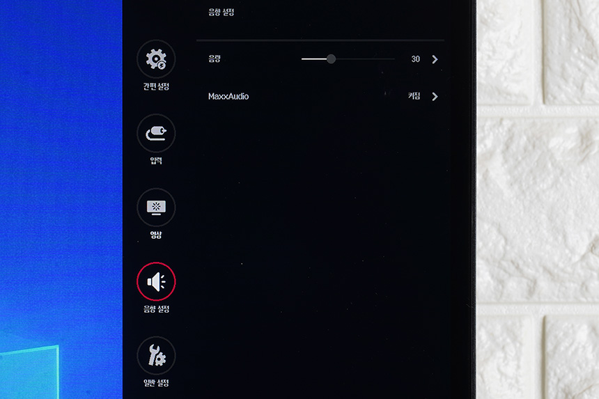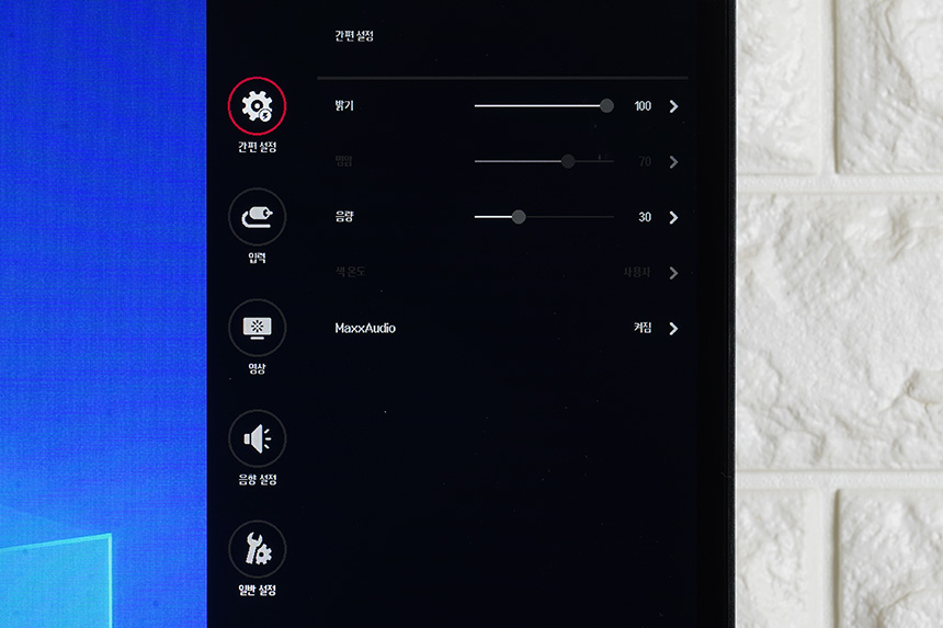 간편 설정을 확인해보면 밝기나 음량 그리고 MaxxAudio 등을 변경할 수 있는 메뉴들이 준비되어 있습니다. 특히 저는 LG 울트라HD 모니터 360 27UN880에 스피커가 내장되어 있다는 점이 공간 활용 측면에서 유용한 부분이라고 생각되었습니다.