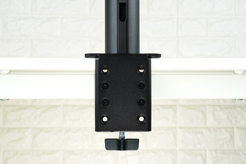 LG 울트라HD 모니터 360 27UN880을 설치하는 방법은 간단한 편입니다. 우선 3세대 스탠드의 하단부를 책상의 모서리 부분에 고정해주면 됩니다. (최대 90mm 두께의 책상에 장착할 수 있습니다.) 참고로 책상에 케이블 구멍이 없는 경우(C타입)과 있는 경우(T타입)를 구분해서 설치할 수 있습니다.