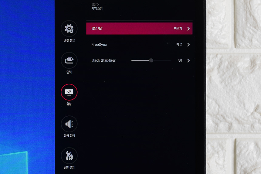 게임 조정에서는 응답 속도를 빠르게 설정할 수 있는데 FPS 등 찰나의 순간으로 승패가 결정되는 게임을 플레이할 때 유용한 옵션입니다. 그리고 어두운 곳도 한눈에 파악할 수 있는 다크맵 모드(Black Stabilizer) 메뉴도 준비되어 있습니다.