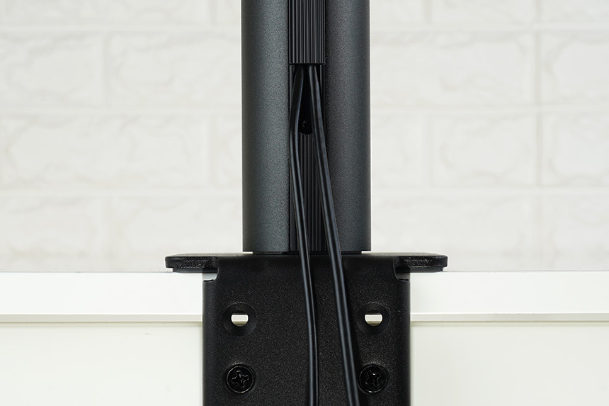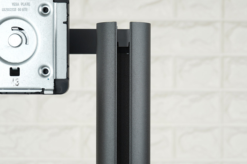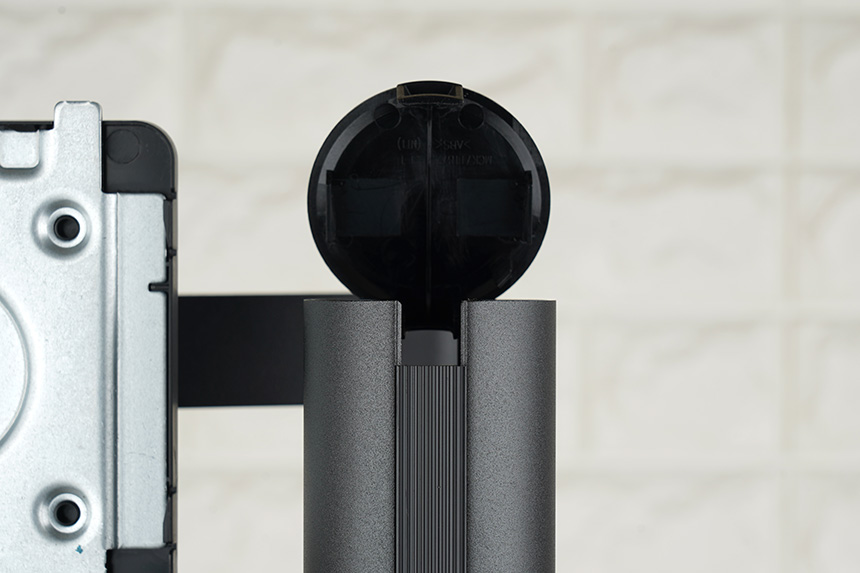 3세대 스탠드 내부의 케이블 수납 공간은 어느 정도 여유가 있는 편이어서 전원선과 HDMI 케이블 정도는 큰 불편함 없이 정리할 수 있습니다. 한 가지 팁을 드리자면 스탠드를 움직이면 케이블도 함께 따라 이동하는 구조로 되어 있는데요. 박스 내 동봉된 케이블에 동그란 홀더가 달려 있는데, 이 부분을 히든 케이블 스탠드 상단 내 공간에 걸리도록 세팅하고 뚜껑을 닫아 주시면 화면 이동 시 케이블 제약이 발생하지 않습니다.