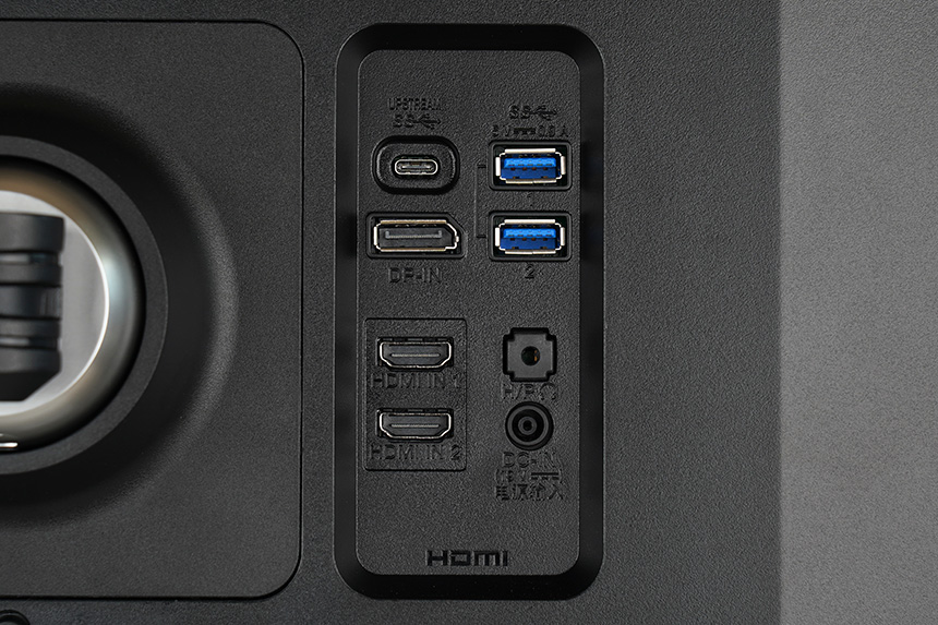입출력 단자를 확인해보면 USB C타입과 DP, HDMI x 2 그리고 USB A타입 x 2 등 다양한 포트들이 준비되어 있습니다. 그중에서 유용한 부분은 USB-C 단자를 이용해서 노트북의 충전(60W)과 데이터 전송을 동시에 할 수 있다는 점입니다.