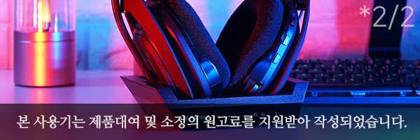 로지텍 아스트로 A50의 디자인은 게임용 헤드셋 중에서 최고 수준이라고 생각되었습니다. 그래서 책상 위에 올라 놓았을 때 인테리어 소품처럼 활용할 수 있습니다. 그렇지만 최근에 유행하고 있는 RGB 조명이 탑재되지 않았다는 점은 조금 아쉽지만, 사용 시간 측면에서 오히려 장점이 있습니다.