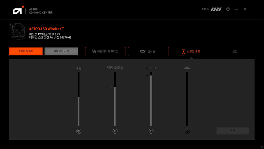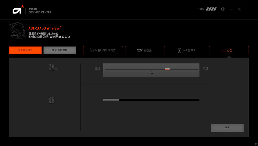 설정에서는 음성과 게임의 사운드 밸런스를 조절할 수 있습니다. 그리고 좌우와 센터에서 경고음이 표시되기 때문에 ASTRO COMMAND CENTER 소프트웨어를 실행시키지 않고도 대략적인 밸런스 상태를 확인할 수 있습니다.