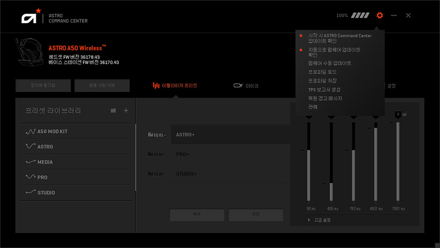로지텍 아스트로 A50에는 정밀하게 이퀄라이저를 설정할 수 있는 기능들이 탑재되었고 동영상이나 음성을 감상하는 용도로도 부족하지 않은 성능을 제공해줍니다. 다목적으로 활용할 수 있는 제품이라고 할 수 있습니다.