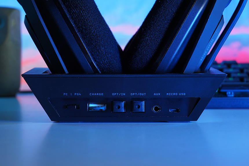 베이스 스테이션의 뒤쪽을 살펴보면 PC와 PS4를 전환할 수 있는 스위치와 다른 제품을 충전시켜줄 때 사용하는 USB 포트 그리고 OPTICAL IN/OUT, AUX, 마이크로 USB 포트 등이 배치되어 있습니다. 컴퓨터에 연결할 때에는 USB 케이블만 설치해주면 됩니다.