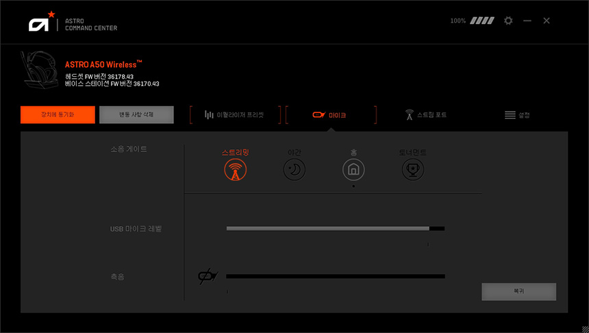 마이크를 확인해 보면 소음 게이트를 스트리밍이나 야간 그리고 홈과 토너먼트 중에서 선택할 수 있습니다. 그리고 USB 마이크 레벨을 변경하거나 측음 기능을 통해서 자신의 목소리를 들을 수도 있습니다.