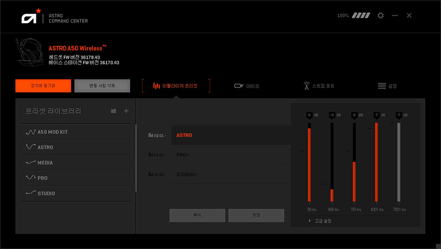 로지텍 아스트로 A50에는 정밀하게 이퀄라이저를 설정할 수 있는 기능들이 탑재되었고 동영상이나 음성을 감상하는 용도로도 부족하지 않은 성능을 제공해줍니다. 다목적으로 활용할 수 있는 제품이라고 할 수 있습니다.