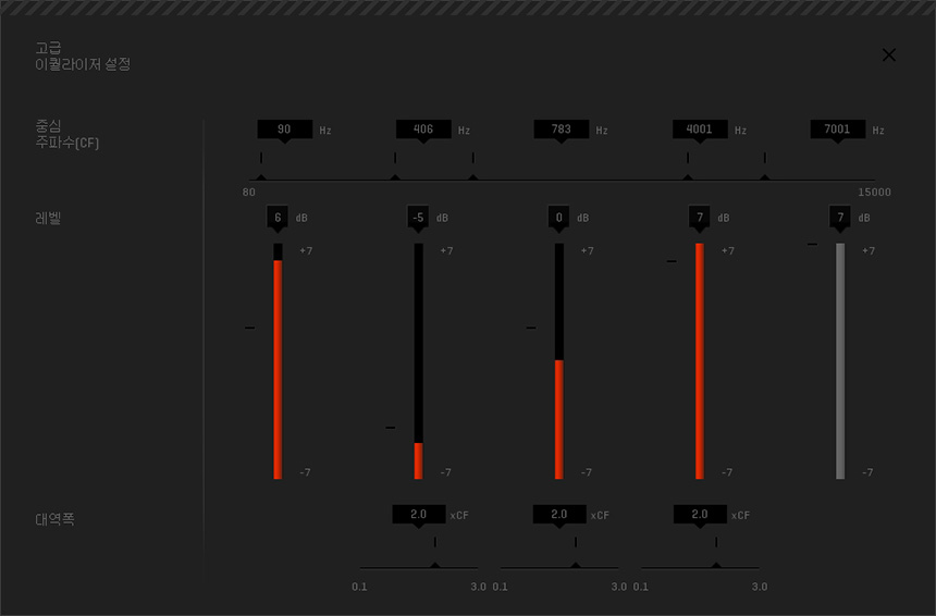 고급 이퀄라이저 설정을 확인해 보면 주파수 별로 레벨을 설정하거나 대역폭도 변경할 수 있습니다. 사운드에 관심이 많은 고급 사용자를 위한 기능이라고 할 수 있고 자신이 원하는 음색을 정밀하게 찾을 수 있다는 장점이 있습니다.