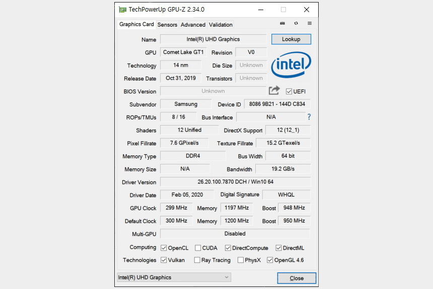 삼성전자 노트북 플러스 NT550XCR-AD2A에는 인텔 UHD 그래픽스 내장 그래픽 카드가 탑재되었습니다. 참고로 그래픽 기본 주파수는 300MHz이고 최대 동적 주파수는 950MHz입니다.
