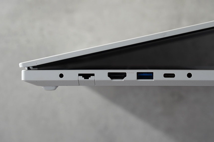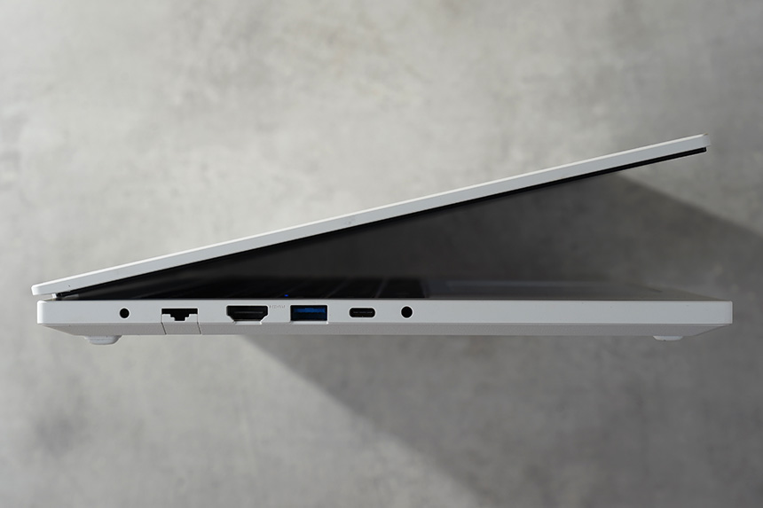 입출력 단자를 확인해보면 왼쪽 옆면에는 전원 커넥터(DC-in)와 유선랜 그리고 HDMI, USB 3.0, USB C타입, 헤드폰 출력 / 마이크 입력 콤보 포트가 배치되어 있습니다.