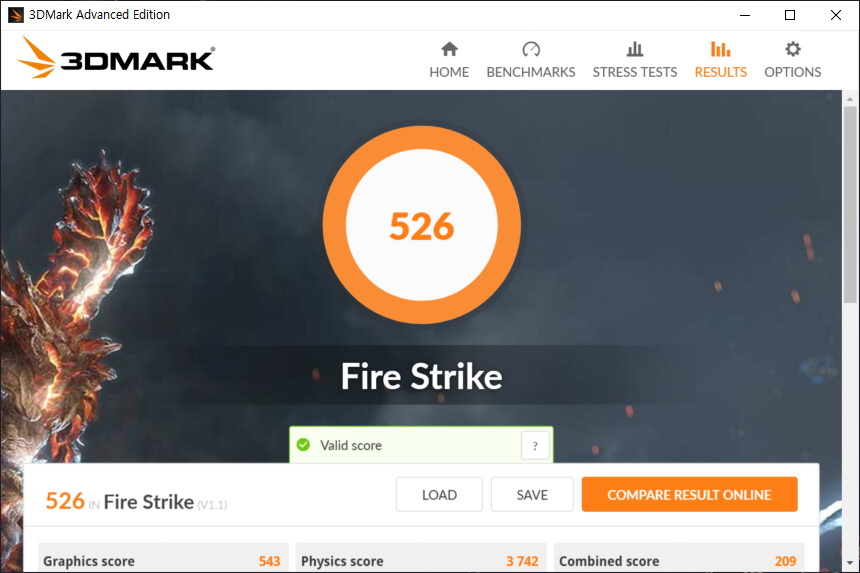 3DMARK Fire Strike(파스)의 점수는 526점이 측정되었습니다. 높은 성능이라고 이야기할 수는 없는데요. 리그 오브 레전드(롤)과 같은 게임을 플레이할 수 있을지는 잠시 후에 확인해보도록 하겠습니다.