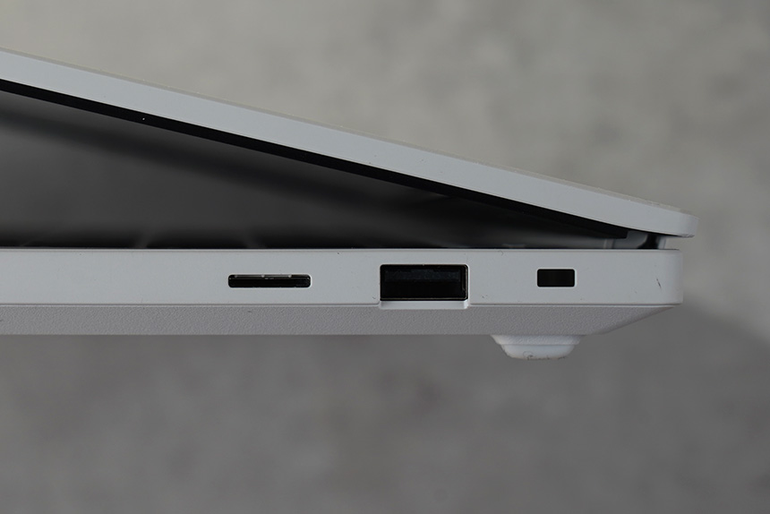 반대쪽 옆면에는 마이크로SD카드 리더와 USB 2.0 그리고 슬림 시큐리티 슬롯이 준비되어 있습니다. 전체적인 확장성은 부족하지 않은 수준이라고 판단되었습니다.