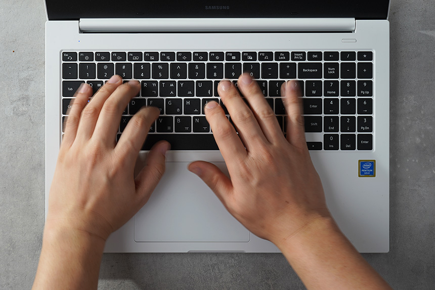 삼성전자 노트북 플러스 NT550XCR-AD2A 키캡의 크기는 기존 자사 제품(NT550EBE) 대비 약 10% 증가해서 오타가 잘 나지는 않는 편입니다. 그렇지만 키캡의 높이가 조금 낮아서 구분감이 약하다는 점은 아쉬운 부분입니다.