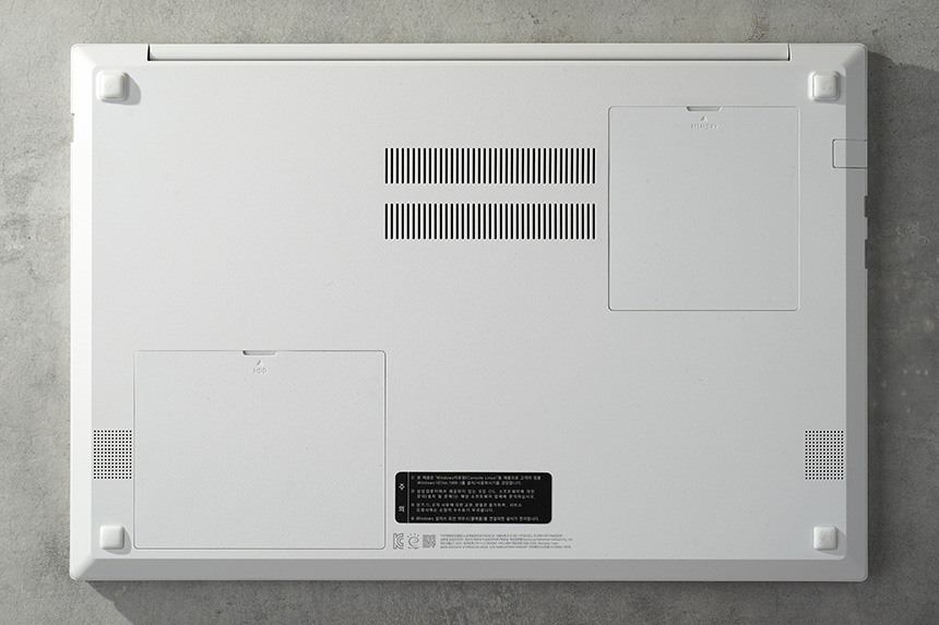 바닥 역시도 깔끔하게 디자인되었습니다. 그리고 모서리 부분에는 총 4개의 고무 지지대가 배치되어 있어서 책상 위에 잘 미끄러지지 않는다는 장점이 있습니다. 그리고 다른 노트북과는 다르게 간편하게 메모리나 HDD를 업그레이드할 수 있는 구조를 채택했습니다.