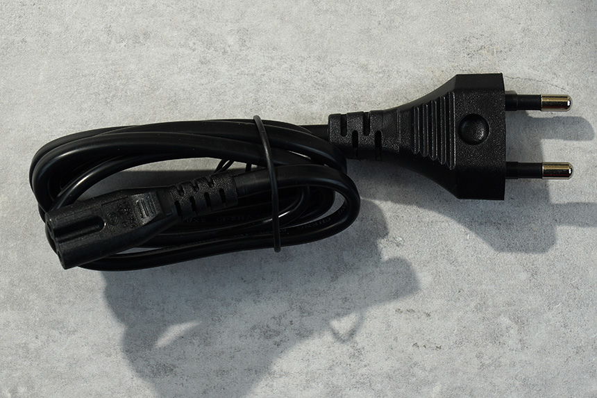 구성품에는 일반적으로 많이 사용되는 8자 전원 코드가 포함되어 있습니다. 참고로 길이는 1m이고 별도의 접지선을 내장하고 있지는 않기 때문에 노트북을 충전할 때 팜레스트에서 전기가 올 수 있습니다.