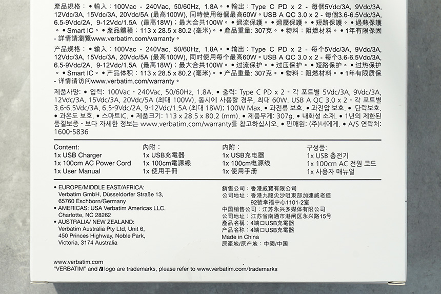 박스의 뒷면을 살펴보면 버바팀 140W 멀티 충전기의 주요 특징이 설명되어 있습니다. 입력은 프리볼트를 지원해서 해외에서도 사용할 수 있고 출력은 여러 장치를 사용할 때에는 최대 140W이고 단일 포트로는 100W입니다.