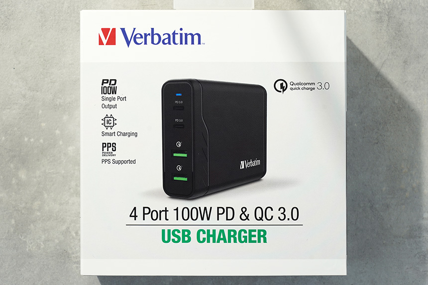 버바팀 140W 멀티 충전기의 박스를 살펴보면 주요 특징이 설명되어 있습니다. 우선 최대 출력은 140W이고 단일 포트 사용 시 최대 출력은 100W입니다. 그리고 PD 충전과 쿨컴 퀵차지 2.0/3.0을 지원합니다.