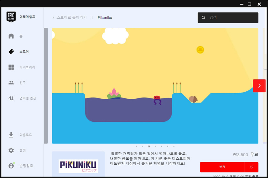 Pikuniku는 에픽게임즈에서 무료로 배포하고 있습니다. 에픽에서는 매주 새로운 게임들을 공개하고 있는데요. 이번에는 타이밍을 잘 맞춘 것 같다는 느낌을 받았습니다.