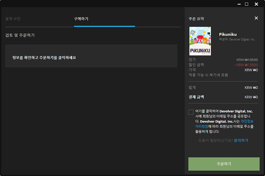 받기를 선택하면 Pikuniku를 다운로드 받을 수 있습니다. 그리고 주문하기 위에 있는 체크 박스를 선택하면 이메일을 제조사와 공유하게 되고 광고 관련 메일이 올 수 있으니 주의하시길 바랍니다.