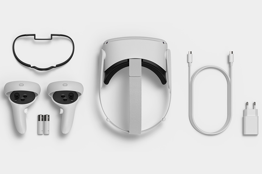 오큘러스 퀘스트2의 구성품을 확인해보면 VR 헤드셋과 2개의 Touch 컨트롤러 그리고 충전 케이블과 전원 어댑터, 안경용 액세서리가 포함되어 있습니다. 부족하지 않은 액세서리 구성이라고 할 수 있습니다.