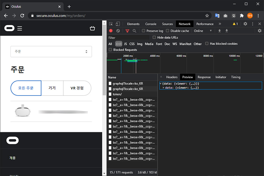 오큘러스 퀘스트2는 구매 단계에서 배송 날짜를 확인할 수 있지만, 주문 이후에는 내용을 확인하지 못해서 답답해하는 분들이 많습니다. 이럴 때는 우선 크롬으로 주문 페이지에 접속한 후에 F12 버튼을 누른 후에 위쪽에 있는 Network 탭을 클릭해주면 됩니다.