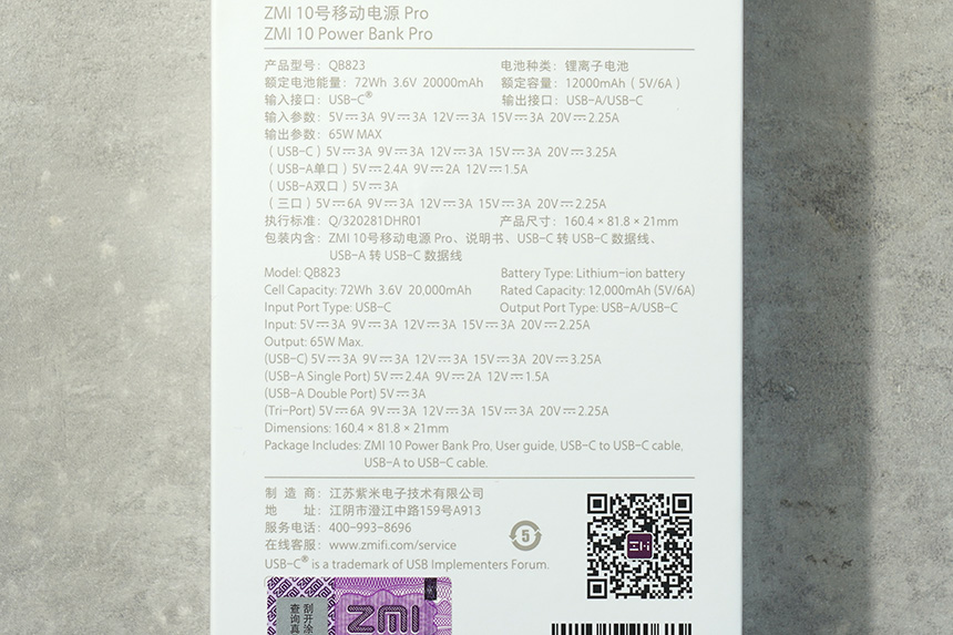 박스의 뒷면에는 샤오미 ZMI QB823 보조배터리의 스펙이 표시되어 있습니다. 배터리 용량은 72Wh 3.6V 20,000mAh입니다. 그런데 전압을 올려서 충전해야 하므로 스마트폰이나 태블릿의 충전 횟수를 산술적으로 계산할 수는 없습니다.