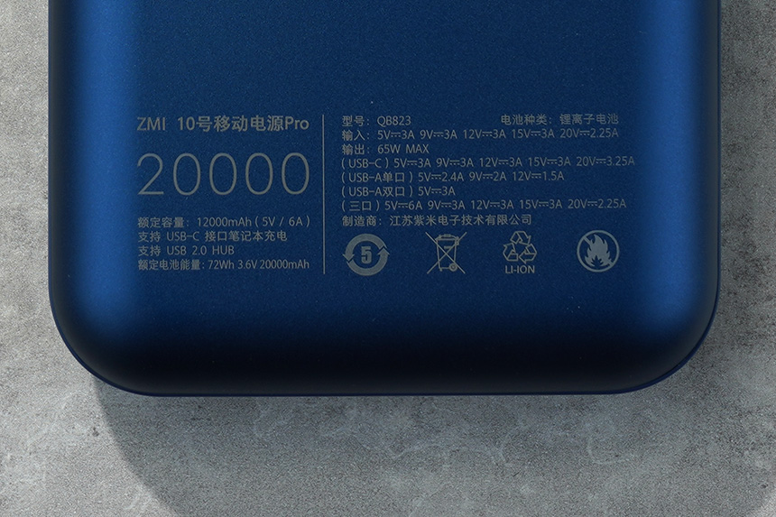 뒤쪽을 살펴보면 샤오미 ZMI QB823 보조배터리의 특징이 설명되어 있습니다. 입력은 최대 45W까지 받을 수 있고 출력은 65W까지 가능합니다. 그래서 노트북까지 충전을 시켜줄 수 있습니다.