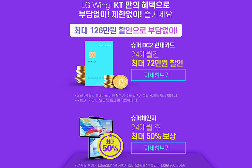 KT에서는 LG 윙(WING) 구매자를 위해서 다양한 사은품과 혜택을 준비해놓았습니다. 그래서 구매 계획이 있는 분들은 아래쪽에 배치된 링크를 통해서 내용을 확인해 보시길 바랍니다.