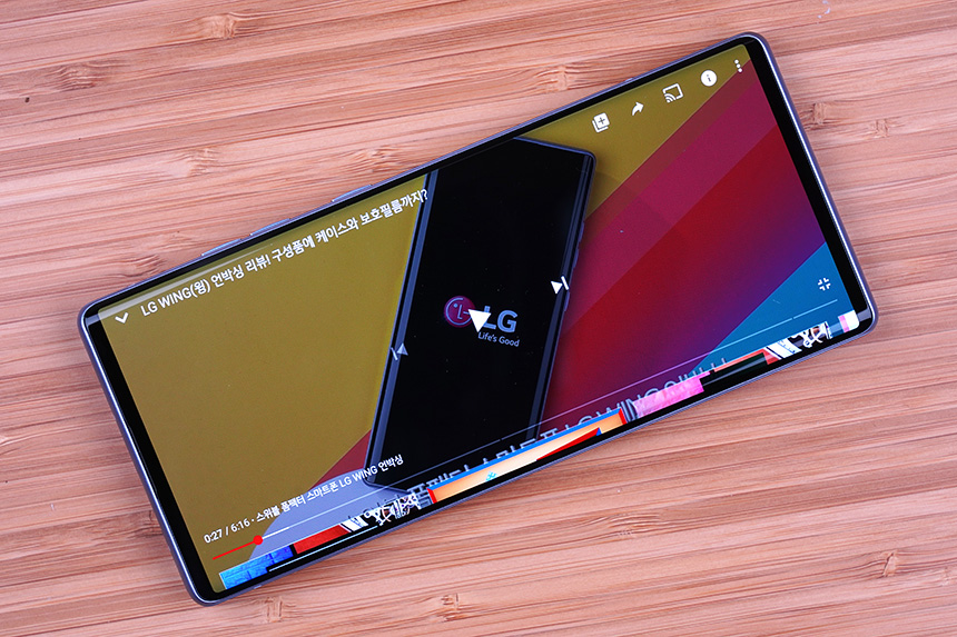 LG 윙(WING)의 노치리스 메인 스크린은 동영상 감상용으로 적합한 특징을 가지고 있습니다. 특히 전면 카메라가 팝업 방식으로 설계되어서 거슬리는 부분이 없다는 장점이 있습니다.