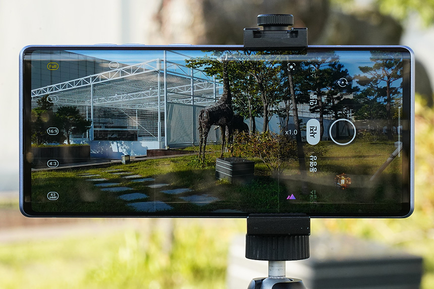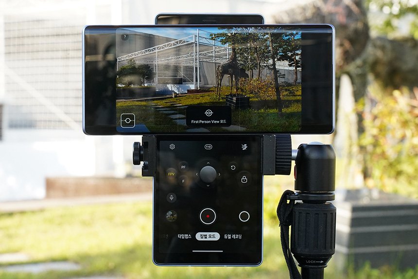 스위블 모드에서 카메라 기능을 실행시키면 짐벌 모드를 사용할 수 있습니다. 1,200만 화소의 센서 중에서 중앙의 FULL HD(1920 x 1080 약 200만 화소) 부분만 사용해서 동영상을 촬영할 때 흔들림을 줄여주는 기능입니다. 소프트웨어적으로 처리하기 때문에 물리적인 짐벌과 비교하면 약간 부족할 수 있지만, 결과물은 의외로 나쁘지 않은 편이었습니다.