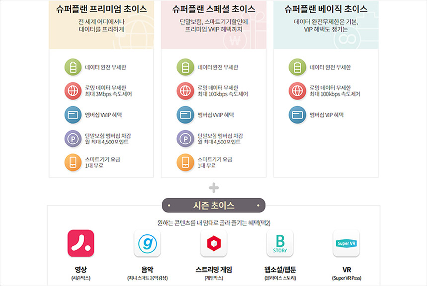 LG 윙(WING)은 5G 스마트폰으로 설계되었습니다. 그래서 KT의 5G 요금제를 확인해 보면 슈퍼플랜 프리미엄 초이스와 스페셜 초이스 그리고 베이직 초이스 등으로 구분되어 있습니다. 그중에서 주목할 만한 부분은 스트리밍 게임(게임박스) 혜택이 추가되었다는 점입니다. 게이머들에게 유용한 부분이라고 할 수 있습니다.