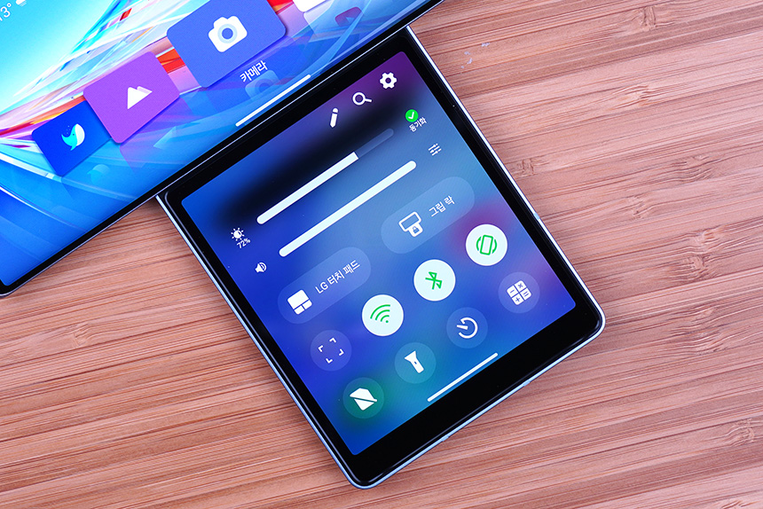 LG 윙(WING)의 노치리스 올레드 풀비전 디스플레이를 회전시키면 내부에 3.9인치 1.15:1 비율의 세컨드 스크린이 모습을 드러내게 됩니다. 미디어 컨트롤러나 손잡이 등 다양한 용도로 활용할 수 있습니다.