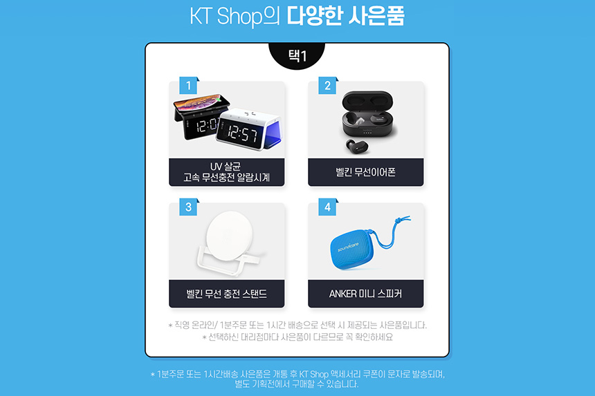 KT SHOP에서 제공하는 사은품을 살펴보면 UV 살균 고속 무선충전 알람시계나 벨킨 무이어폰 그리고 벨킨 무선 충전 스탠드와 ANKER 미니 스피커 중에서 하나를 선택할 수 있습니다.