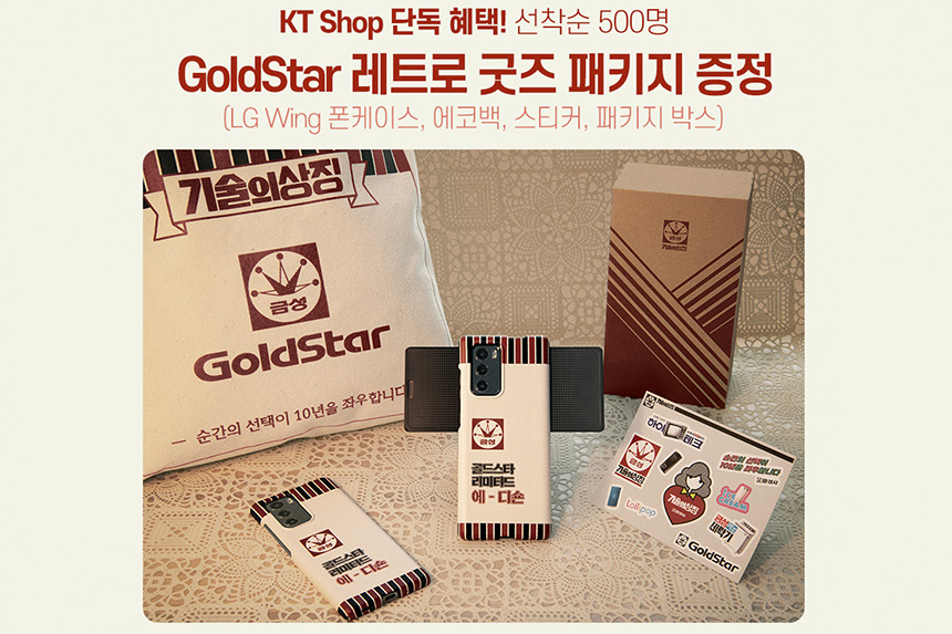 마지막으로 KT SHOP 단독으로 GoldStar 레트로 굿즈 패키지가 선착순 500명에게 제공됩니다. 특히 에코백이나 케이스가 인상적입니다. 그 외에도 LG전자에서는 2년간 디스플레이 파손 시 교체비용의 70%를 지원하는 혜택도 준비해놓았습니다. 그래서 조금 더 안심하고 사용할 수 있습니다.