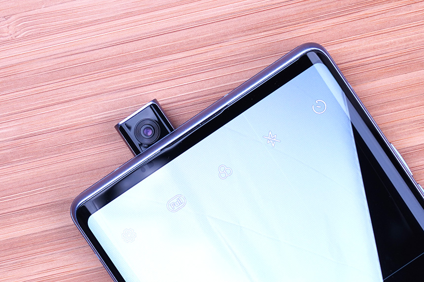 상단을 살펴보면 전면 팝업 카메라가 수납된 것을 확인할 수 있습니다. 일부 중국의 스마트폰에서 채택했던 기능인데요. 디스플레이의 상단을 깔끔하게 디자인할 수 있다는 장점이 있지만, 기계적인 부품으로 구성되어 있어서 파손의 우려가 있다는 단점도 가지고 있습니다.