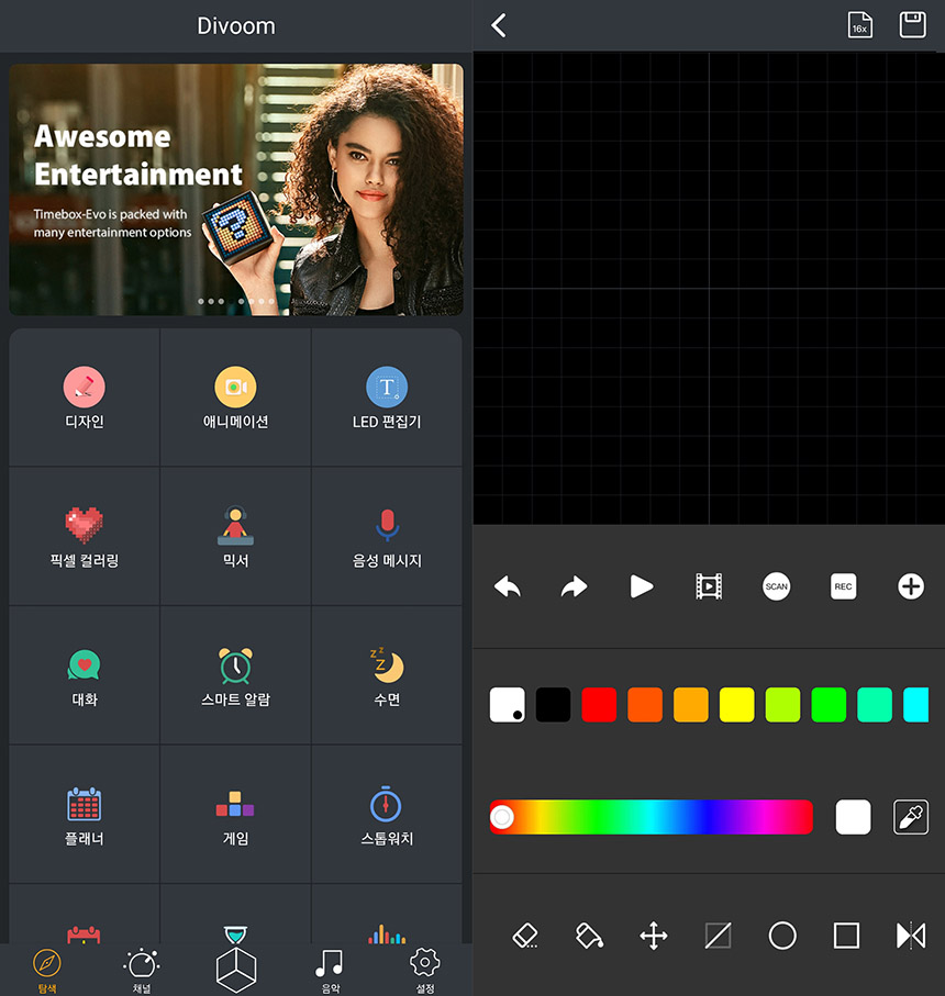 Divoom 전용 앱을 살펴보면 디자인과 애니메이션 그리고 LED 편집기 등 다양한 기능들이 준비되어 있는 것을 확인할 수 있습니다. 그리고 직접 도트를 찍어서 자신이 원하는 픽셀 아트를 제작할 수 있습니다.