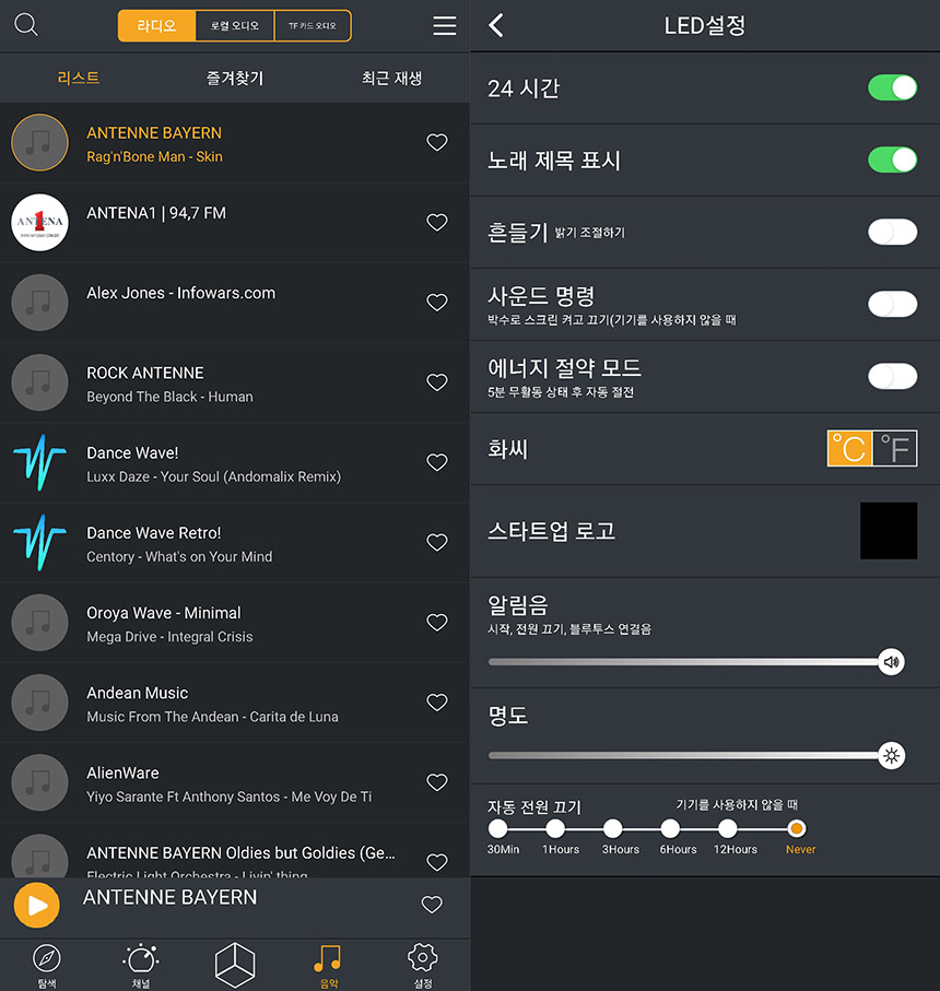 그 외에도 디붐 디투 픽셀아트 블루투스 스피커를 이용해서 인터넷 라디오를 감상할 수도 있고 설정에서는 노래 제목 표시나 알림음 그리고 명도 등을 변경할 수 있습니다.