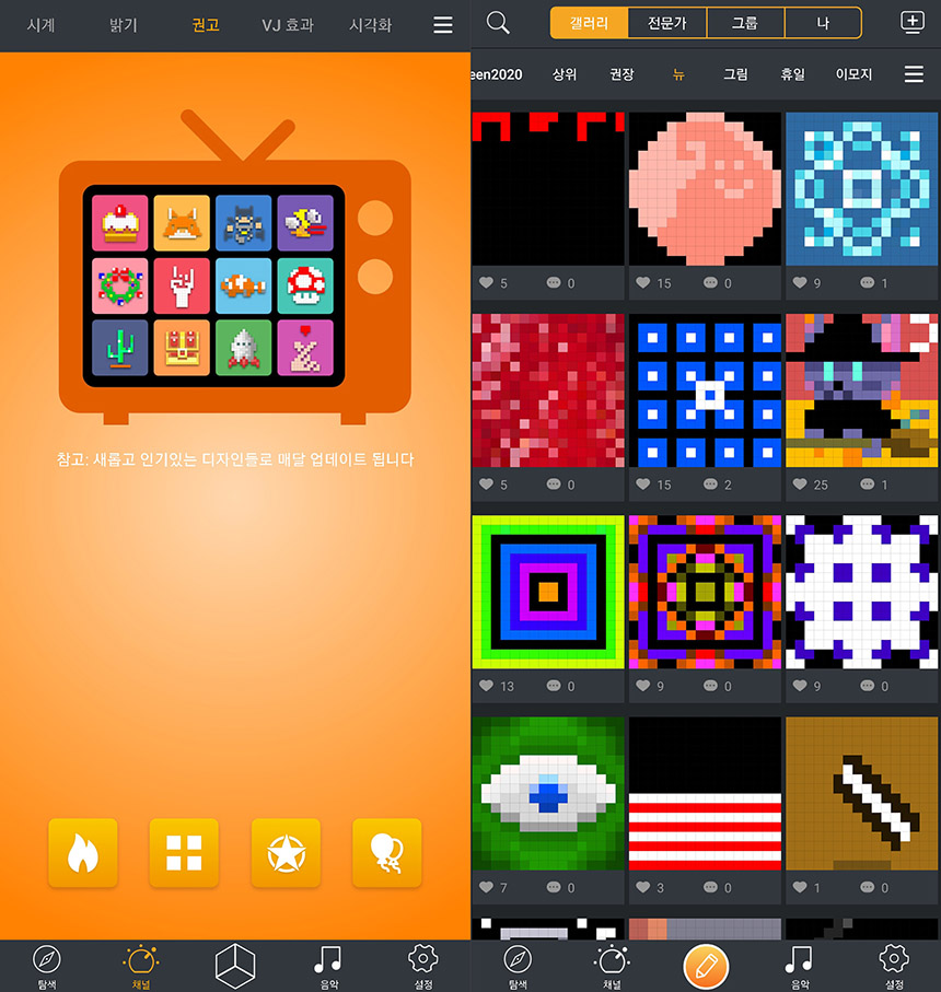 픽셀 아트를 직접 제작하는 일은 생각 이상으로 귀찮습니다. 그래서 전용 앱을 통해서 다른 사람들이 만들어 놓은 이미지나 애니메이션을 다운로드 받을 수 있는 기능을 제공합니다. 종류가 많은 편이어서 둘러보는 재미가 있습니다.