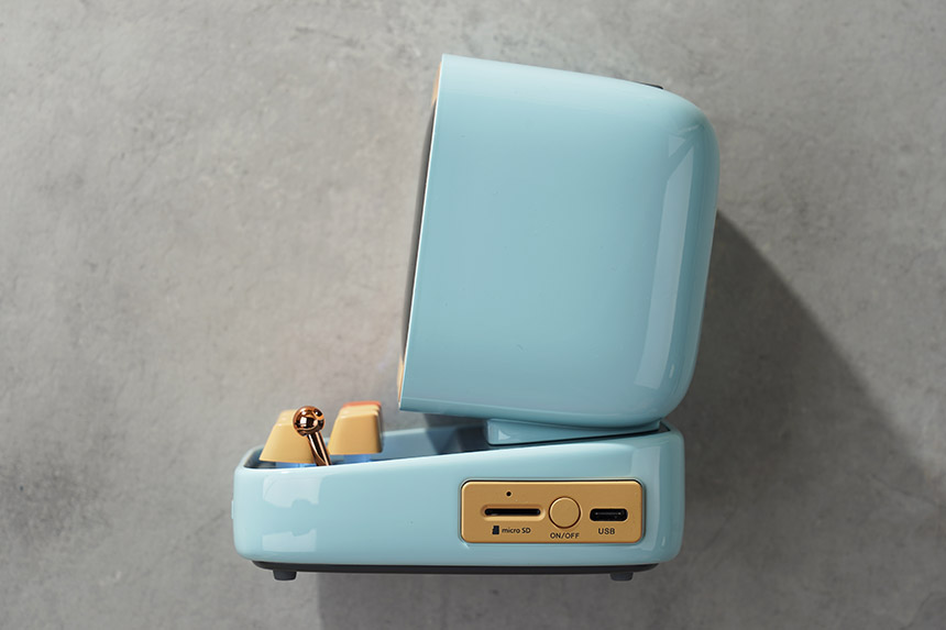 옆쪽을 살펴보면 마이크로SD카드 삽입구와 전원 버튼 그리고 C타입 USB 충전 포트가 배치되어 있습니다. 특히 메모리 카드에 저장된 MP3 파일을 재생할 수 있다는 점이 편리한 부분입니다.