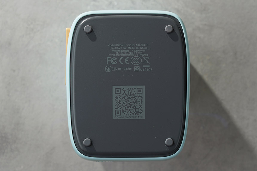 바닥을 살펴보면 모서리 부분에 고무 지지대가 배치되어 있고 무게도 약 505g으로 묵직해서 책상 위에 올려놓았을 때 잘 미끄러지지 않는 편입니다. 그리고 중앙에는 앱을 다운로드 받을 수 있는 QR코드가 인쇄되어 있습니다.