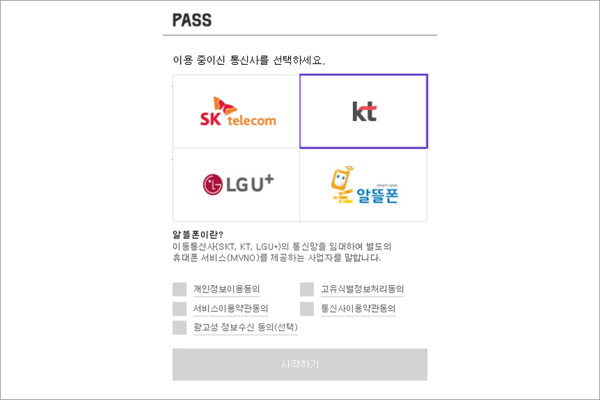 우선 패스 앱을 통해서 인증을 먼저 해주어야 합니다. 우선 통신사는 KT는 선택하고 이름과 휴대폰번호 그리고 보안숫자를 입력하면 스마트폰에 설치된 PASS 앱에 알림이 옵니다.