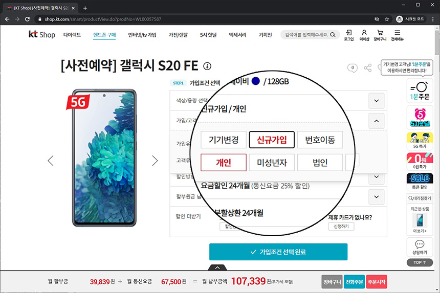 우선 KT 샵에서 자신이 구매하기를 원하는 스마트폰을 선택하고 가입 유형은 신규가입이나 번호이동을 선택해주면 됩니다. 그리고 자신의 상황에 맞는 5G 요금제를 선택해주면 됩니다.