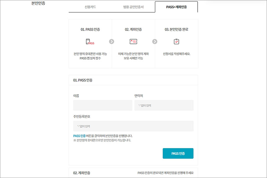 PASS + 계좌인증 방법을 살펴보면 우선 PASS 앱을 통해서 먼저 인증을 하고 그다음에 본인 명의 은행 계좌인증을 하면 본인인증이 완료됩니다. 과정 자체는 크게 복잡하지 않은 편입니다.