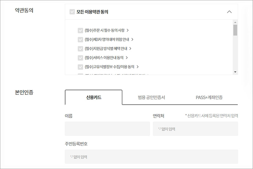 주문 시작을 선택하면 우선 약관에 동의해야 하고 아래쪽에 다양한 종류의 본인인증 수단이 준비되어 있는 것을 확인할 수 있습니다. 그리고 PASS + 계좌인증을 이용하면 신용카드나 범용 공인인증서가 없는 분들도 휴대폰을 개통할 수 있습니다.
