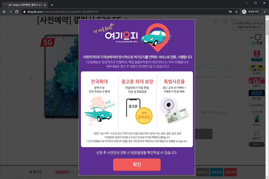 참고로 KT에서는 여기오지라는 서비스를 운용하고 있는데요. 원하는 시간과 장소에서 컨설턴트가 직접 방문해서 스마트폰의 개통을 진행해주는 서비스입니다. 효도폰으로 부모님 휴대폰을 교체하려는 분들에게 특히 유용하다고 할 수 있습니다.