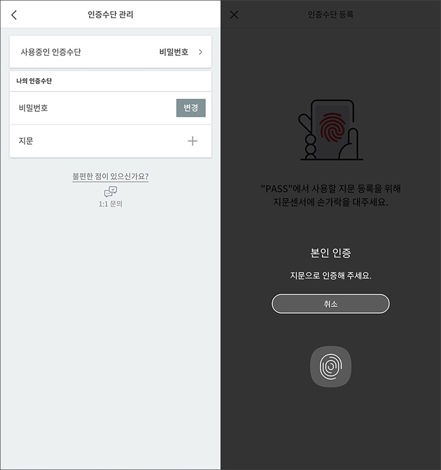 그리고 스마트폰에 설치된 PASS 앱의 인증 수단에 지문 기능을 추가했으면 편리하게 본인인증을 할 수 있습니다. 간편하게 인증을 할 수 있다는 점이 패스 앱의 가장 큰 장점입니다.