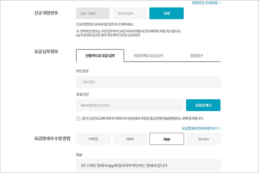 마지막으로 신규 희망번호나 요금 납부정보 그리고 요금명세서 수령 방법 등을 입력하면 KT 샵에서 스마트폰 구매 절차가 완료됩니다. 차분하게 따라한다면 크게 어려운 부분은 없을 것 같습니다.