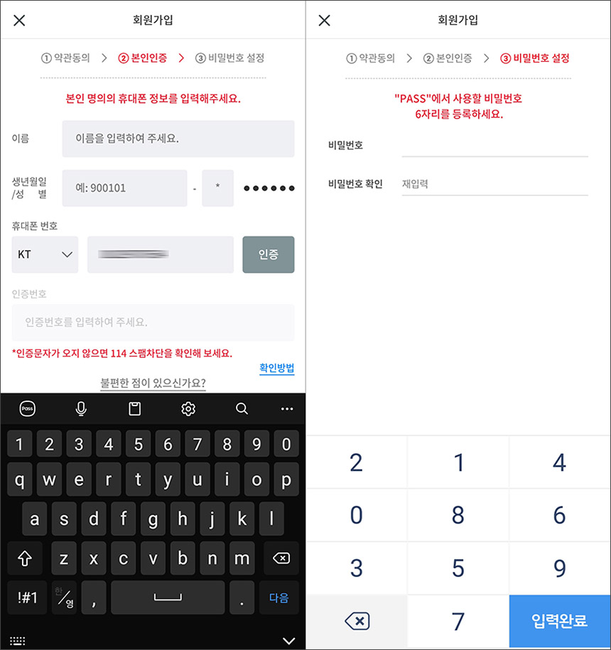 다음에는 이름과 생년월일 그리고 휴대폰 번호를 입력해서 본인인증을 해야 합니다. 이때 자신 명의의 스마트폰이 필요합니다. 그리고 PASS 앱을 사용할 때 필요한 6자리의 비밀번호도 설정해주면 됩니다.