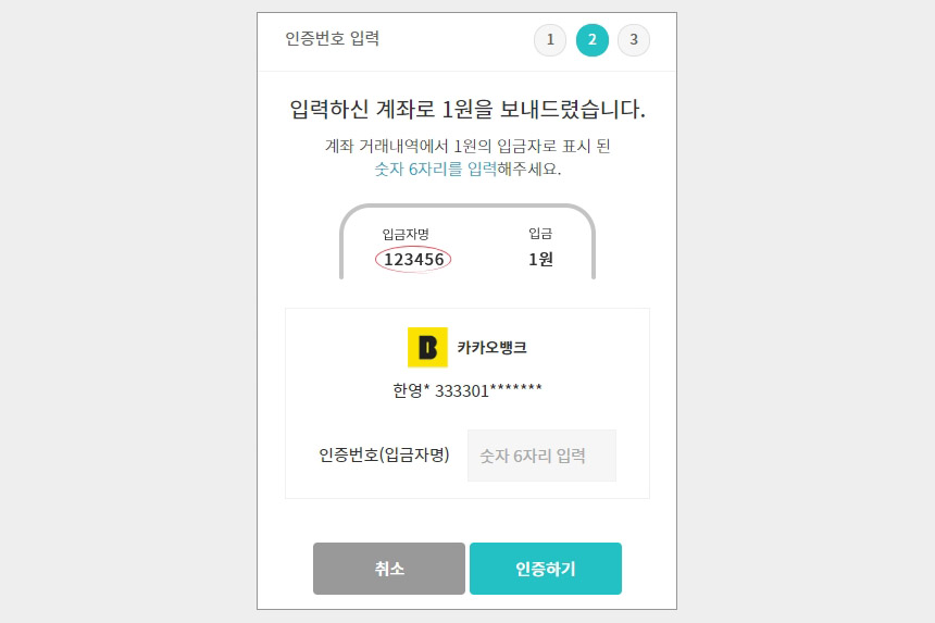 계좌인증 요청을 하면 자신의 통장에 1원이 입금됩니다. 100번 시도하면 100원이라서 여러 번 신청하지 않는 것이 좋을 것 같습니다. 그리고 이름은 부분에 6자리의 숫자가 표시됩니다.